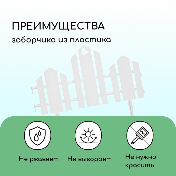 Декоративный заборчик для сада изготовлен из качественного и прочного пластика, который устойчив к воздействиям окружающей среды. Нет необходимости убирать садовый бордюр на зиму. В холодную погоду не подвергайте забор каким-либо воздействиям, так как пластик становится хрупким.