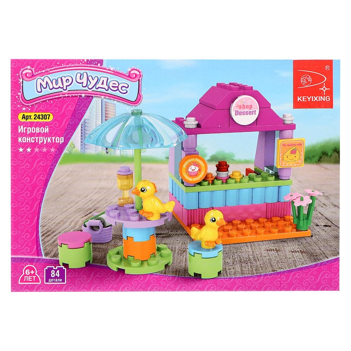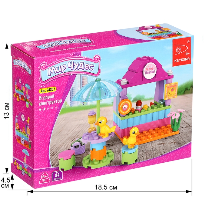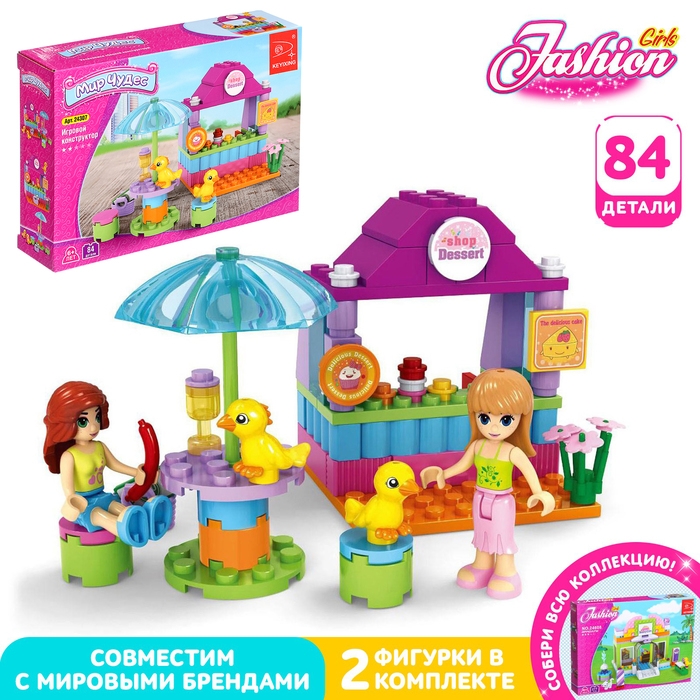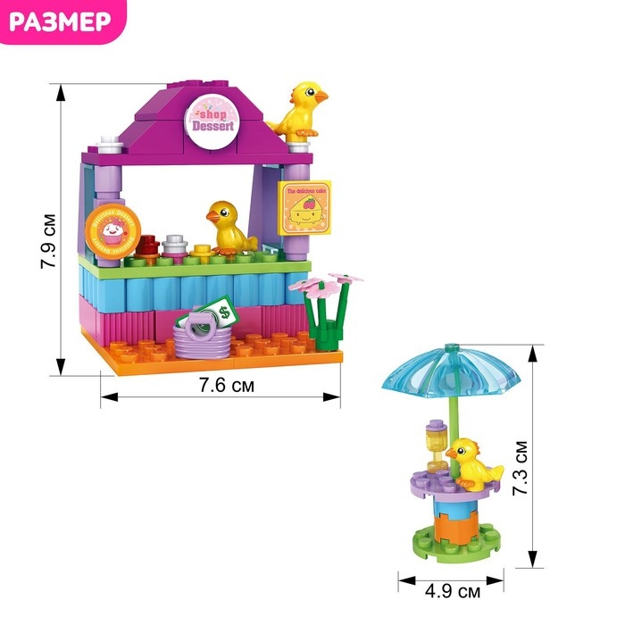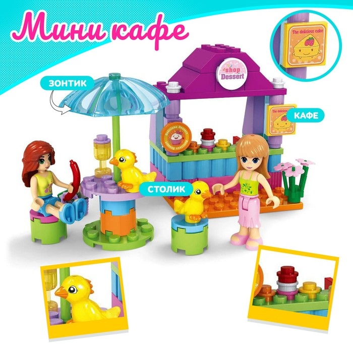 Набор содержит 84 детали и позволяет сконструировать буфет, обеденную зону, продукты и фигурки посетителей.