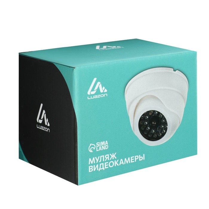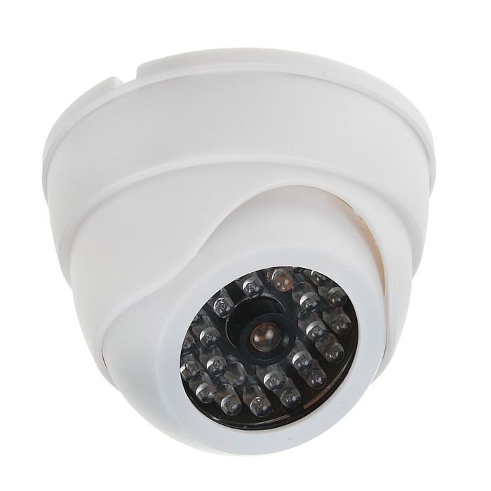 Устройство выполнено в виде купольной камеры и оснащено светодиодным индикатором, который имитирует работу настоящего прибора. Муляж работает от двух батареек и легко крепится к потолку. В комплект входят шурупы и пластмассовые дюбели для установки.