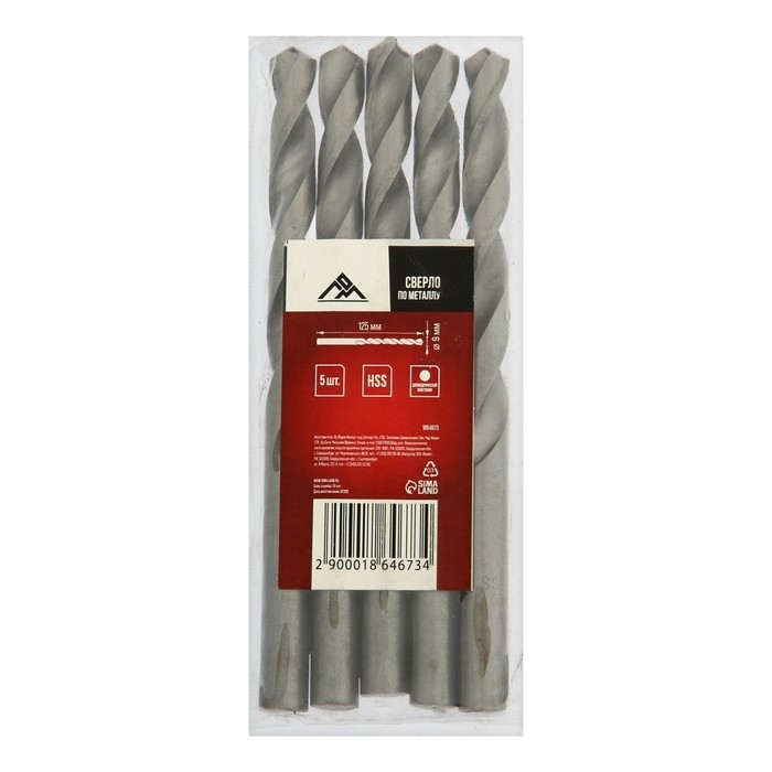 Сверло по металлу ЛОМ, HSS, цилиндрический хвостовик, 9 х 125 мм, 5 шт.