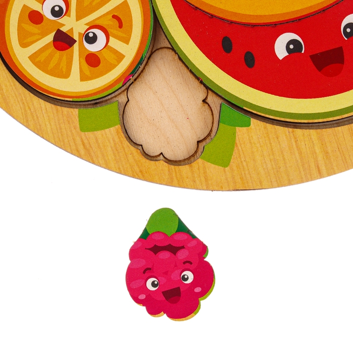 Необычная головоломка и сочетает в себе пазл и рамку-вкладыш. Задача крохи — правильно разместить красочные фигурки на деревянном основании, чтобы получилась цельная картинка.
