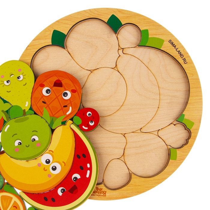 Определите с малышом положение фигурок и попросите ребёнка назвать каждую. Устройте фрукты на предназначенные им места — в этом помогут силуэты на основании игрушки.