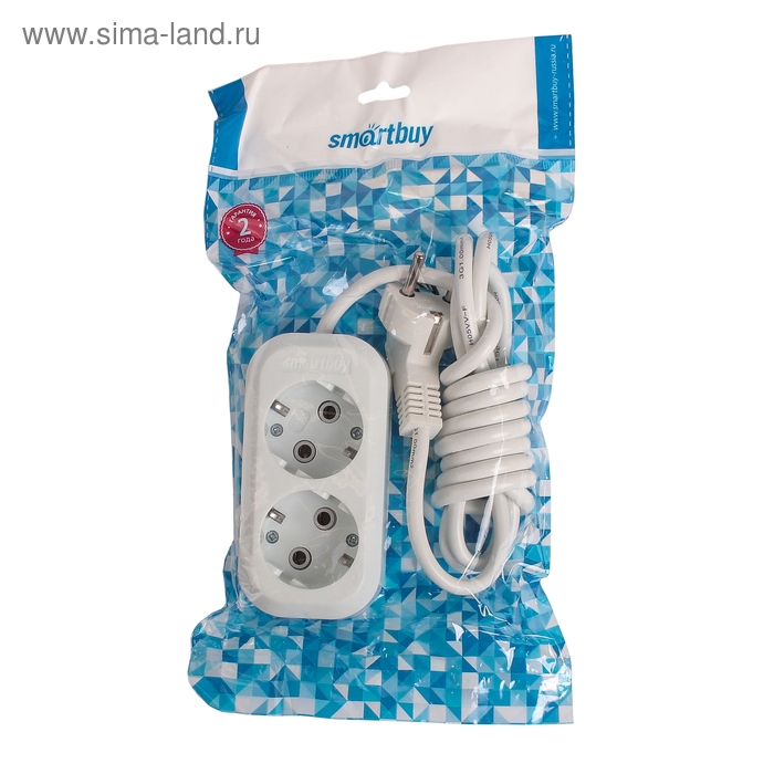 Удлинитель Smartbuy, 2 розетки, 2 м, 16 А, 3500 Вт, ПВС 3х1 мм2, с з/к, белый