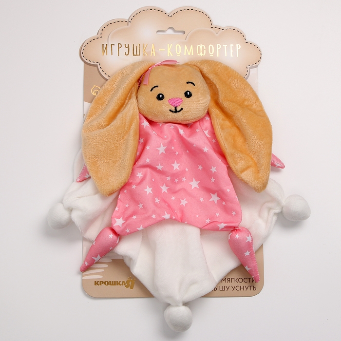 Такое изделие подойдёт ребёнку не только для крепкого сна, но и в качестве первой игрушки, так как оно не имеет твёрдых или острых деталей. Комфортер выполнен из плюшевой ткани, мягкой и приятной на ощупь.