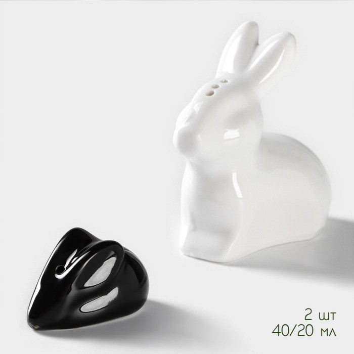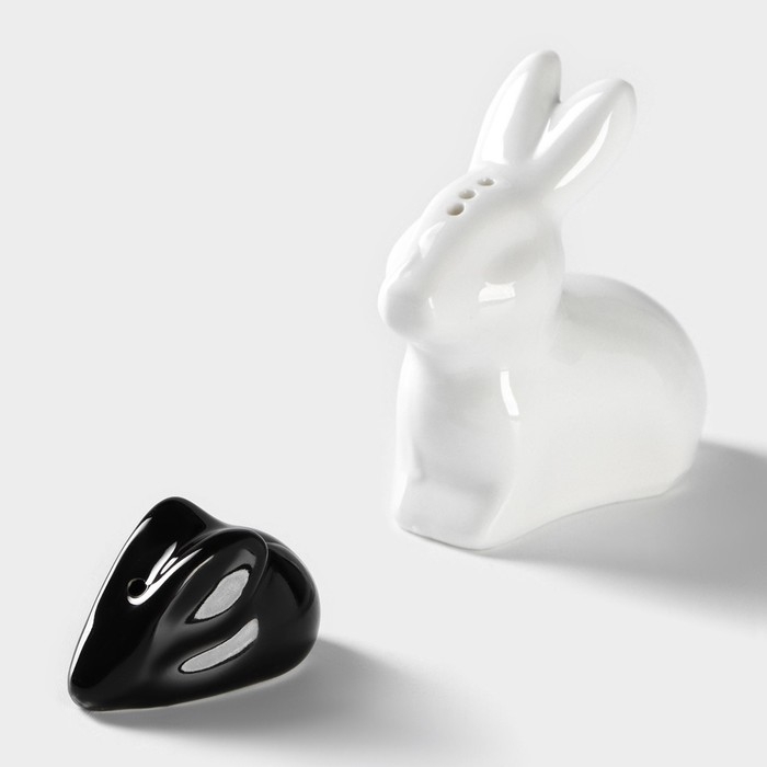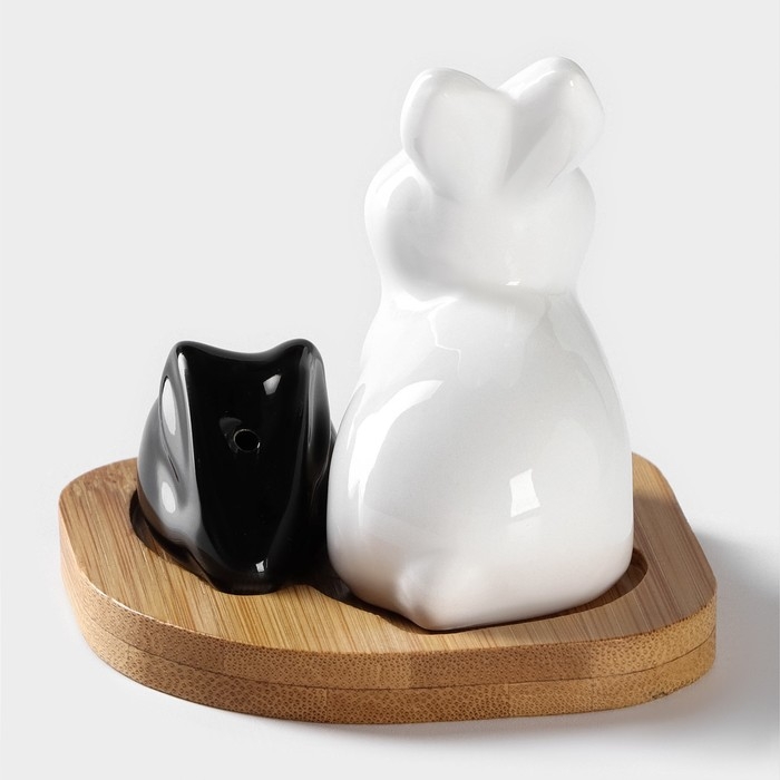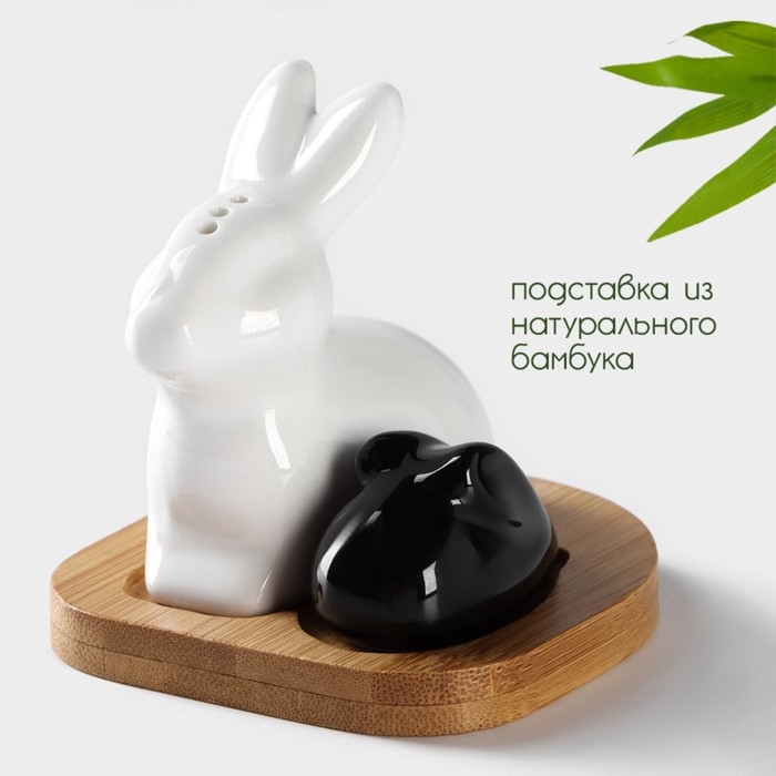 Набор фарфоровый для специй на бамбуковой подставке BellaTenero «Зайцы», 3 предмета: солонка 50 мл, перечница 20 мл, подставка, цвет белый и чёрный