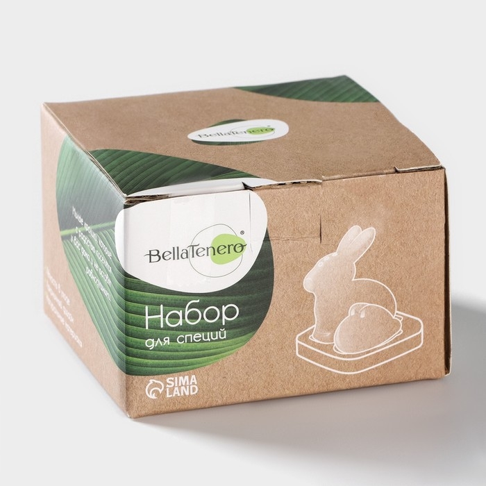 Набор для специй BellaTenero «Зайцы» изготовлен из качественного фарфора. Кухонные изделия из фарфора отличаются прочностью и надёжностью, устойчивы к появлению царапин и резким перепадам температур. Благодаря оригинальному дизайну и причудливым формам набор отлично впишется в интерьер вашей кухни и станет настоящей изюминкой при сервировке.