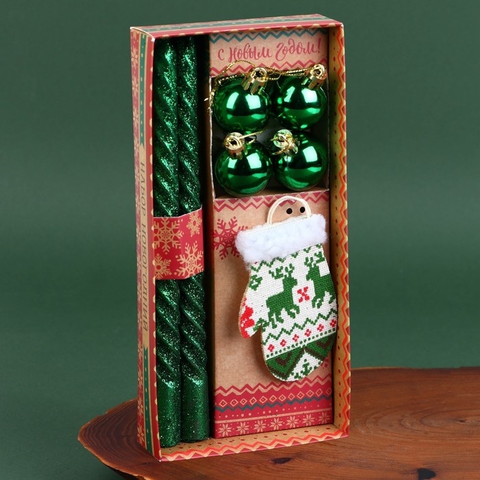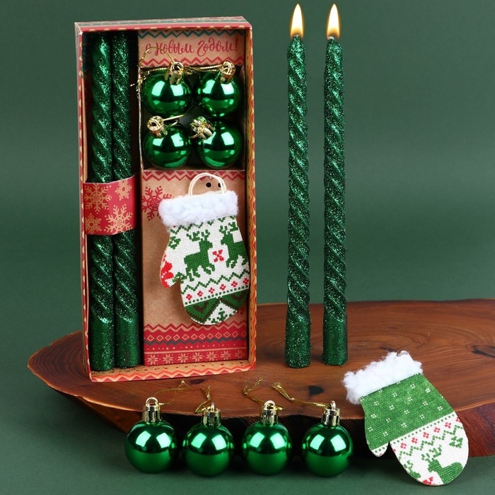 Набор витых свечей с декором прекрасно впишутся в любой новогодний интерьер и создадут праздничное настроение. Такой подарок отлично подойдет для подарка вашим родным и близким, благодаря красивой упаковке. В набор входит 2 античные свечи (1,5 х 1,5 х 20 см.), 4 елочных шара (2,5 х 3,5 см.) и подвеска на елку в виде варежки (5,5 х 0,5 х 8,5 см.)