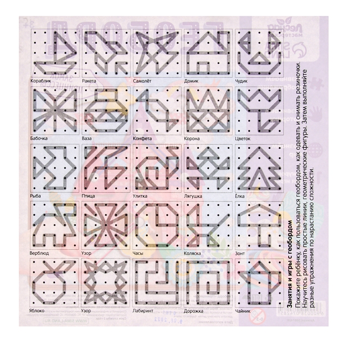 Геоборд представляет собой плоское поле (обычно в форме квадрата или прямоугольника) с равноудалёнными друг от друга штырьками. Суть игры - создавать различные фигуры, надевая на штырьки резиночки. Сначала предложите малышу повторить схемы из набора, а затем попросите придумать историю и обыграть её с помощью резиночек на геоборде.