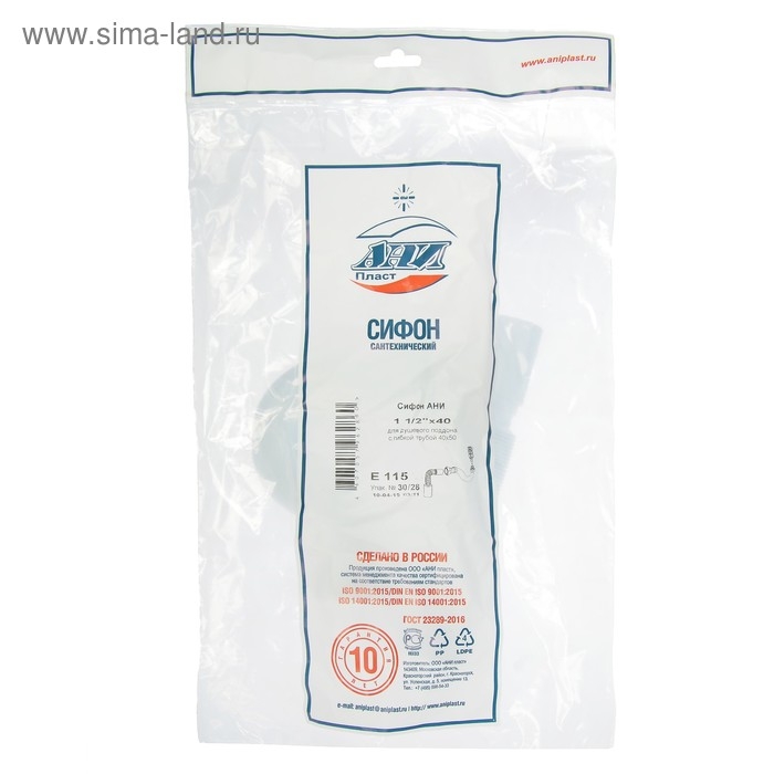 Сифон для душевого поддона "АНИ Пласт" E015, 1 1/2", плоский, с гофротрубой 40 x 50 мм