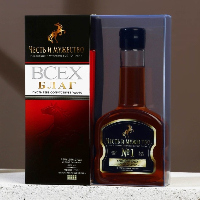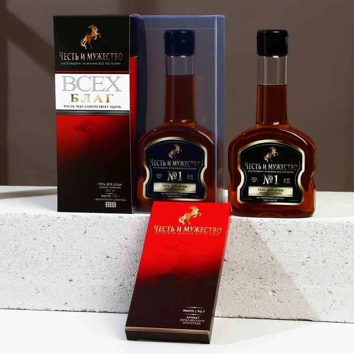 Новогодний подарочный набор косметики «Честь и мужество», гель для душа во флаконе коньяка 250 мл и мыло для рук в форме шоколада, Новый Год