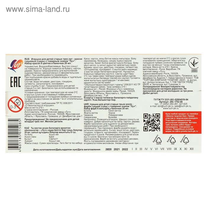 Гуашь "Школа творчества" изготовлена по улучшенной рецептуре. Благодаря этому цвета краски, не теряя своей яркости и красоты, стали максимально подготовлены для быстрого рисования. Краску не нужно предварительно сильно разбеливать и тратить при этом много белил. Благодаря меньшему расходованию белил из набора, цвета красок теперь будут заканчиваться равномерно, что позволит использовать набор более рационально. При высыхании краска не выцветает, приобретает бархатистую поверхность, имеет отличную укрывистость. Гуашь легко смывается с рук и одежды. Не имеет неприятного запаха. Абсолютно безопасна для детского творчества.