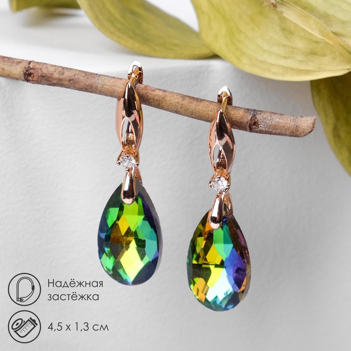 Серьги со стразами «Иллюзион» капля на овале, цвет бело-бензиновый в розовом золоте