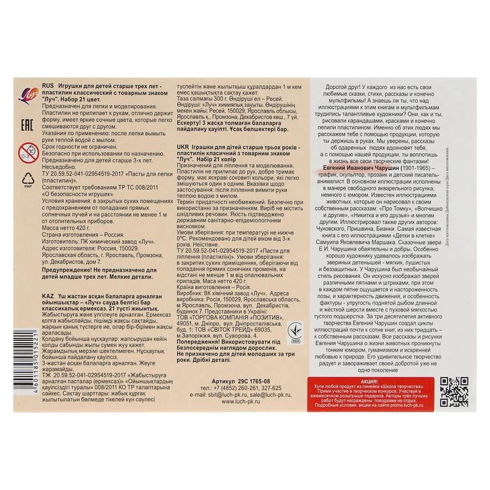 Пластилин детский "Школа творчества" изготовлен по новой рецептуре. Как и традиционный классический пластилин он обладает отличной пластичностью и органолептикой. Имеет красивые чистые цвета с матовым эффектом. Держит форму, не плавится, не растекается при высоких температурах (до +40 градусов С). Можно использовать в технике рисования, так как в отличие от классического пластилина при размазывании по бумаге даёт дорожку длиннее на 30%. Легко смывается водой или влажной салфеткой с любой поверхности.