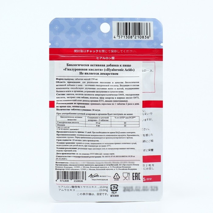 Состав: лактоза, носитель целлюлоза микрокристаллическая Е460i, гиалуроновая кислота, экстракт сока эмблики, носитель эфир сахарозы и жирных кислот Е473, антислёживающий агент диоксид кремния Е551, ниацин (никотинамид).