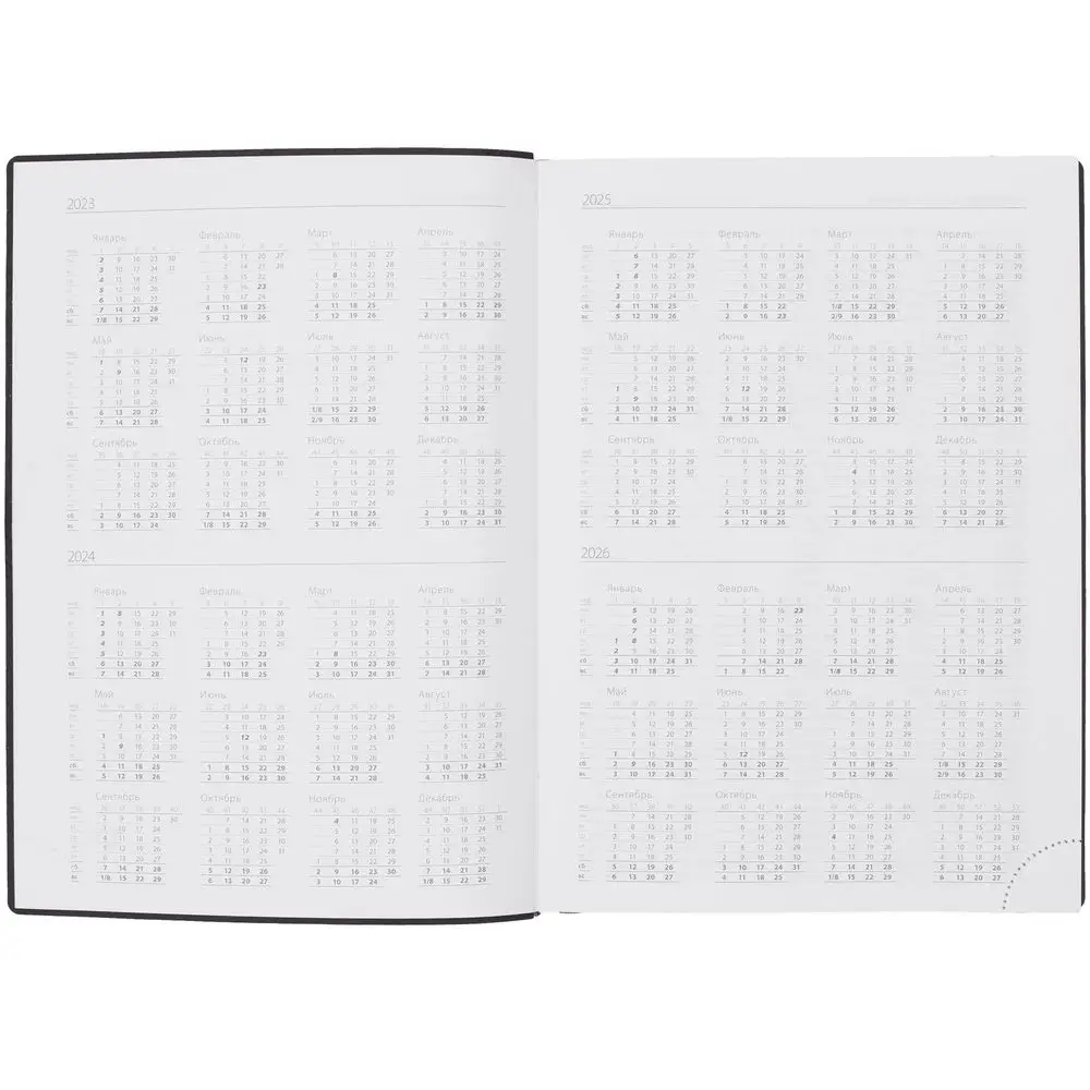 Ежедневник с гибкой обложкой выполнен из материала Latte, черный АА, и дополнен резинкой шириной 1 см, капталом и ляссе черного цвета.