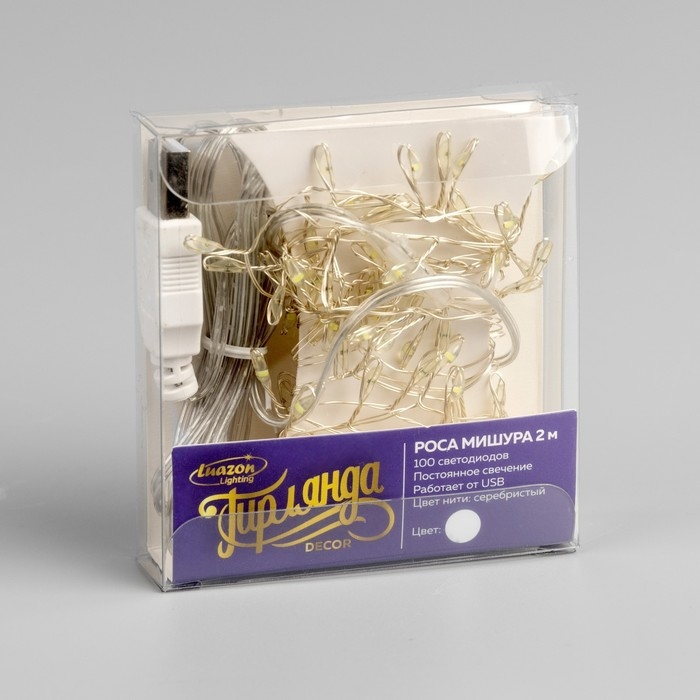 Гирлянда «Мишура» 2 м роса, IP20, серебристая нить, 100 LED, свечение белое, USB