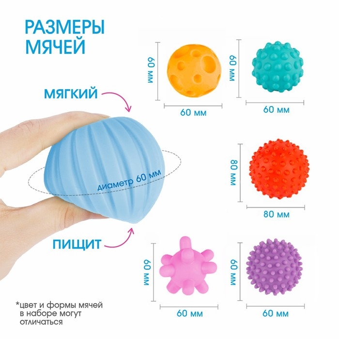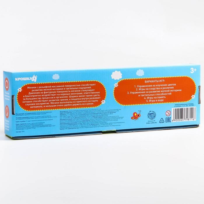Мячики с рельефной массажной поверхностью способствуют развитию мелкой моторики и тактильных ощущений. Давление на фактурную поверхность мячиков стимулирует и благоприятно воздействует на нервные окончания, ответственные за большинство процессов в организме. Шарики имеют яркие цвета, которые способствуют развитию зрения, а пищалка внутри развивает слуховое восприятие.