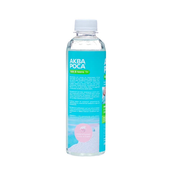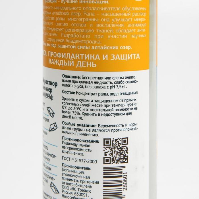 Состав: концентрат рапы, вода очищенная. Рапа — это озерная соль, природный минерально — солевой комплекс, образующийся в экологически чистых соленых озерах Алтайского края. Эффективность рапы доказана. Содержит 17 минералов и биологически активных компонентов (Основные минералы: CL, Na, HCO3, SO4, Mg, K, Ca, Fe, Zn).