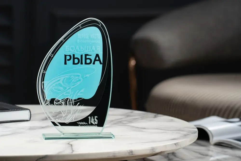 На задней поверхности расположена полимерная наклейка, которая создает эффект зеркала внизу на лицевой стороне награды.