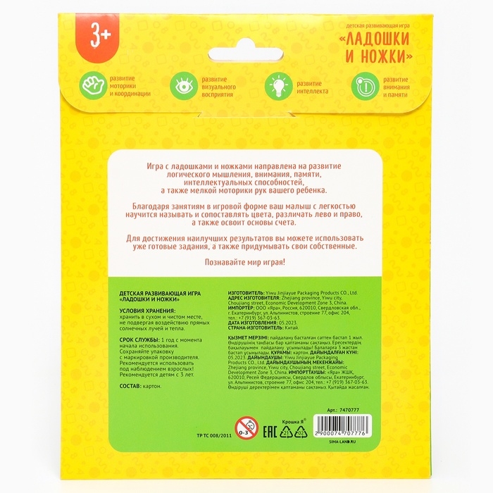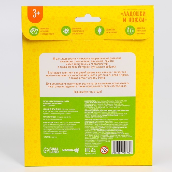 Развивающий игровой набор «Ладошки и ножки» 16 карточек+Задания, Крошка Я