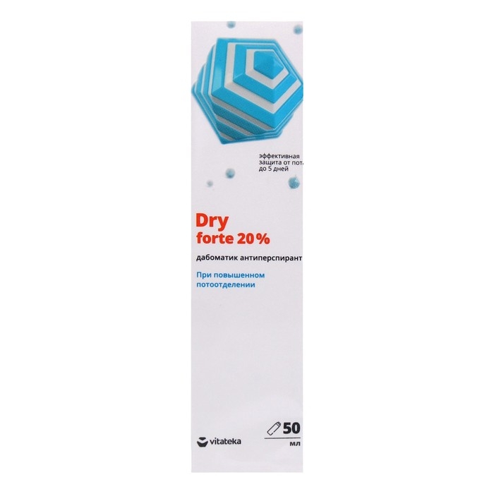Дезодорант Драй Форте дабоматик 20 % ВИТАТЕКА обеспечивает эффективную защиту от пота на срок до 5 дней. Дезодорант выполнен в форме дабоматика: флакона с насадкой-аппликатором из сетчатой нейлоновой материи. При переворачивании флакона материя насадки увлажняется антиперспирантом и наносится на поверхность кожи точечными прикосновениями. Для чувствительной кожи, для кожи ног, головы, подмышек, ладоней, для мужчин, женщин, подростков. АКТИВНЫЕ КОМПОНЕНТЫ: Сокращение объема потоотделения обеспечивается за счет высокого содержания солей алюминия в составе. В основе действия лежит взаимодействие гексагидрата хлорида алюминия с кожным белком. Благодаря этому регулируется система потоотделения и решается проблема избыточной потливости. При использовании DRY функции потовых желез не нарушаются. В организме происходит равномерное перераспределение выделения пота через другие участки тела. Алюминия хлорид гексагидрат не растворяется в порах, не поступает в организм и не влияет на органы и системы. Выводится через поры. Не кристаллизуется на воздухе, не налипает на аппликатор. Не образует хлопьев на коже после нанесения. Обеспечивает нормальный PH. СОСТАВ: Alcohol denat. 70 % vol., Aluminium Chloride Hexahydrate, Aqua, PPG-15 Stearyl Ether..ПРИМЕНЕНИЕ: Встряхнуть флакон. Кожа должна быть чистой, сухой и неповрежденной. Наносить перед сном (через 30-45 минут после душа). Смыть утром водой с мылом и высушить полотенцем обработанные участки. Не использовать в течение дня. Для достижения наилучших результатов удалите волосы в зонах, которые собираетесь обработать. Не наносить DRY в течение 24 часов после эпиляции или бритья. Рекомендуемая частота использования 1-2 раза в 7-10 дней.
