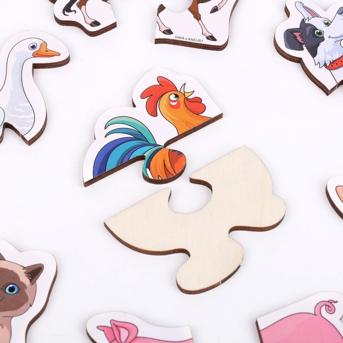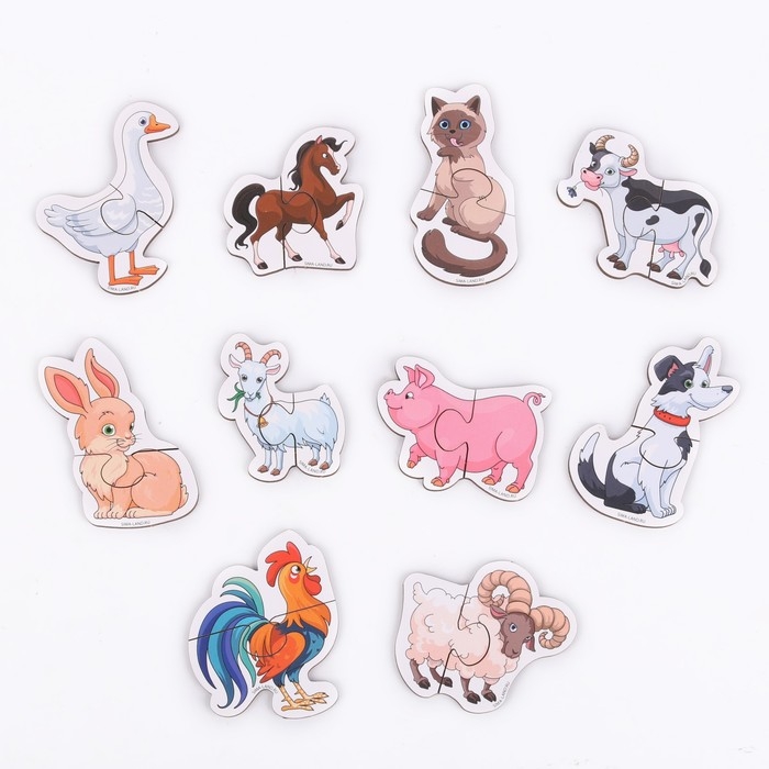 - Малышу предстоит соединить части пазлов так, чтобы получилось животное. Каждая картинка состоит всего из двух деталей, поэтому такой формат головоломки подходит для знакомства с этим видом головоломок.