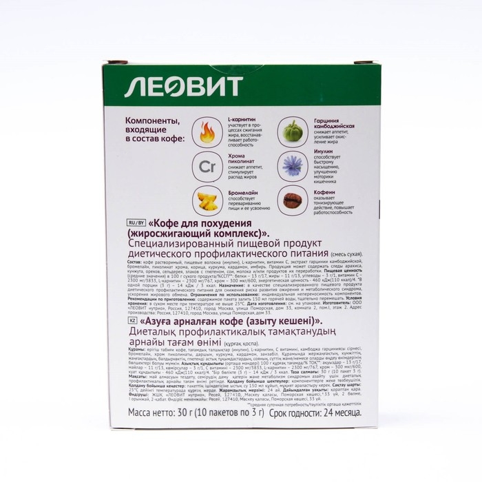 Кофе для похудения Леовит "Жиросжигающий комплекс", 10 пакетов по 3 г