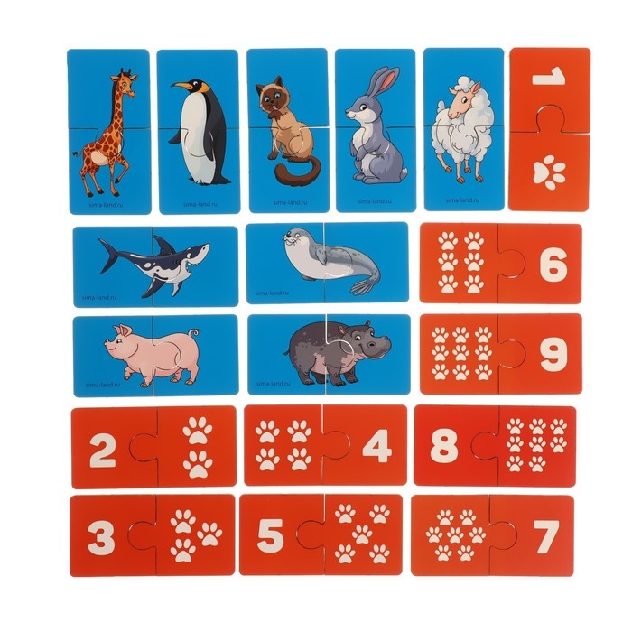 Двусторонние пазлы позволят вашему ребёнку изучить две темы: счёт до 9 и животных.