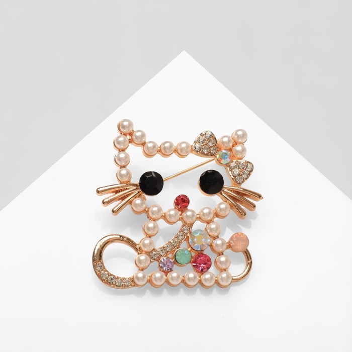 Брошь «Котёнок» из жемчуга, цветная в золоте
