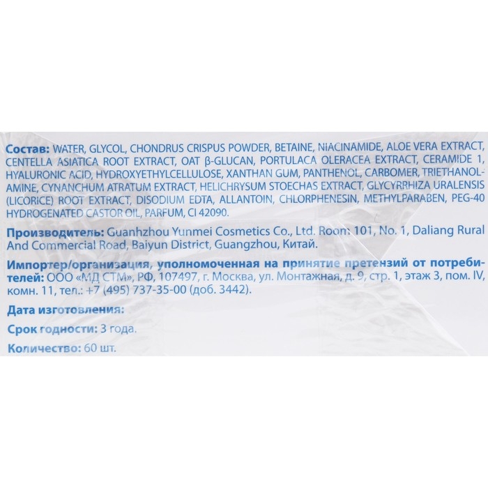 Состав: Water, Glycol, Chondrus crispus powder, Betaine, Niacinamide, Aloe Vera extract, Centella Asiatica root extract, OAT Glucan, Portulaca Oleracea extract, Ceramide 1, Hyaluronic Acid, Hydroxyethylcellulose, Xanthan Gum, Pantenol, Carbomer, Triethanol-Amine, Cynanchum Atratum extract, Helichrysum Stoechas extract, Glycyrrhiza Uralensis (Licorice) root extract, Disodium Edta, Allantoin, Chlorphenesin, Methylparaben, Peg-40 Hydrogenated Castor oil, Parfum, CI 42090.