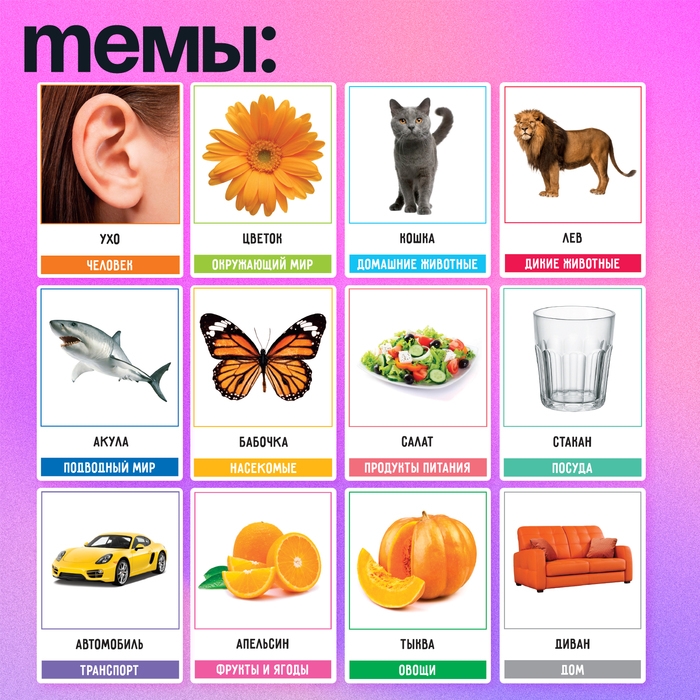 - На крточках вас ждут красочные изображения животных, насекомых, продуктов питания, предметов и т.д.