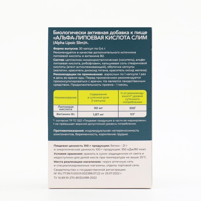 Альфа-липоевая кислота Slim, жиросжигатель, 60 капсул по 400 мг
