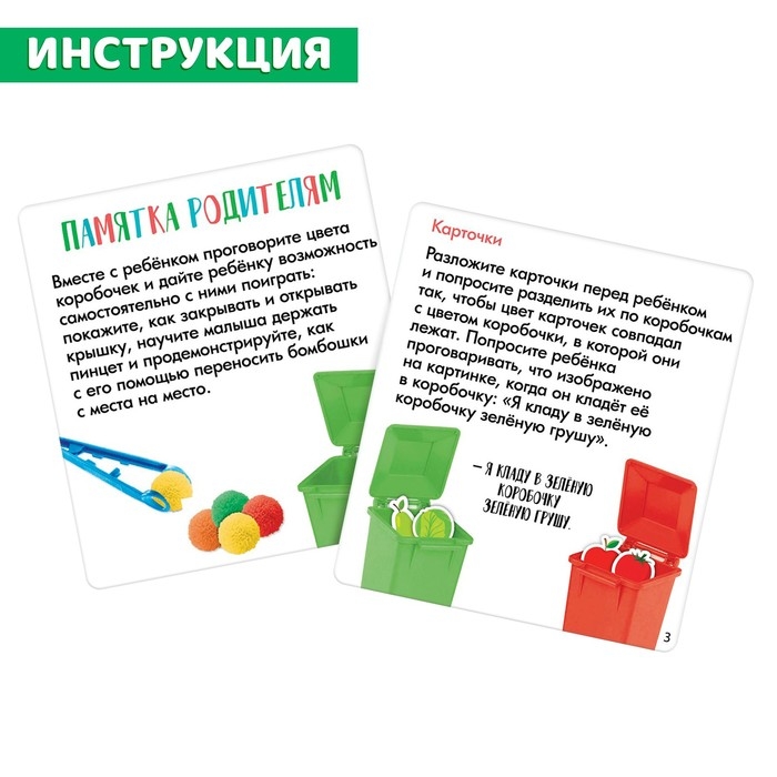 - Попросите ребёнка проговаривать, что изображено на картинке, когда он кладёт её в коробочку: «Я кладу в зелёную коробочку зелёную грушу».
