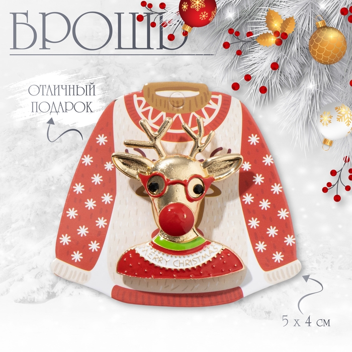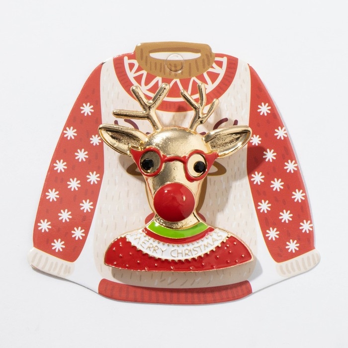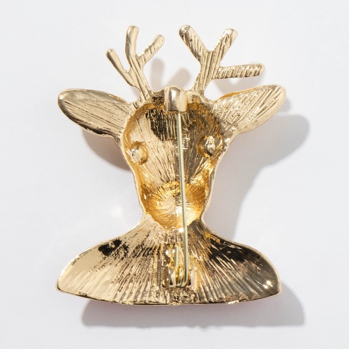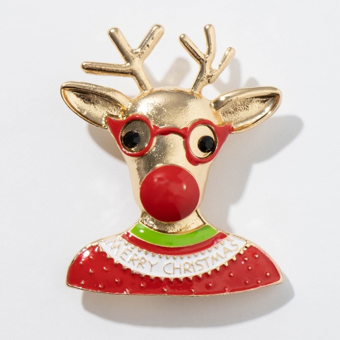 Брошь новогодняя «Олень» в свитере, цветная в золоте