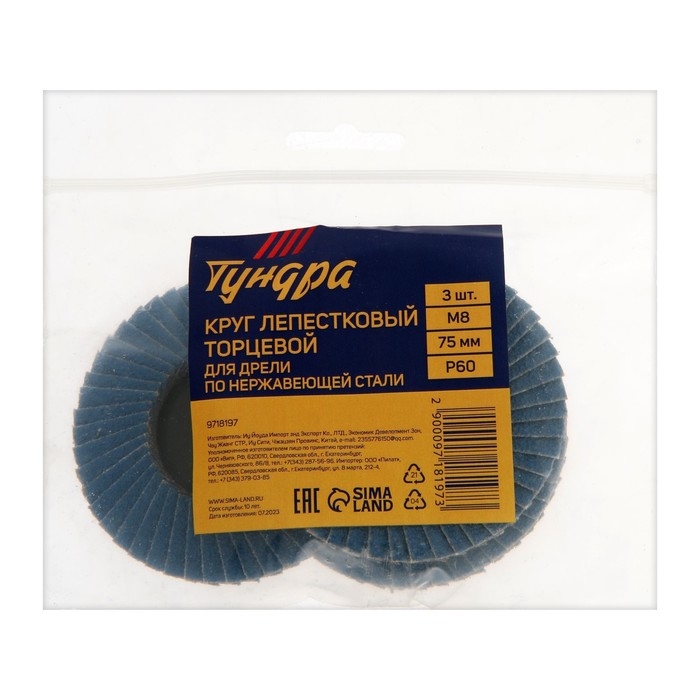 Круг лепестковый торцевой ТУНДРА, по нержавеющей стали, для дрели, М8, 75 мм, P60, 3 шт.
