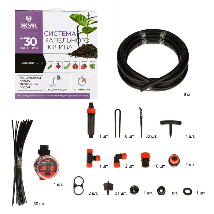 Набор капельного полива от водопровода, на 30 растений, с таймером, «Жук»