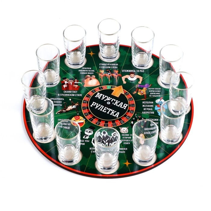 Алкогольная рулетка – одна из самых популярных игр для веселой компании. Она представляет собой копию рулетки из казино. По всему колесу расположены отверстия для специальных стопок.