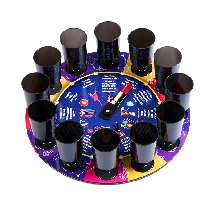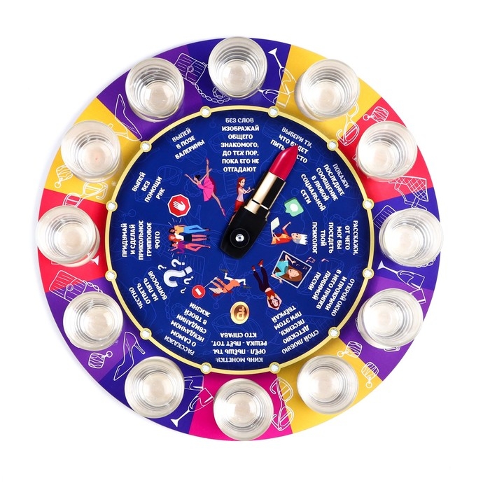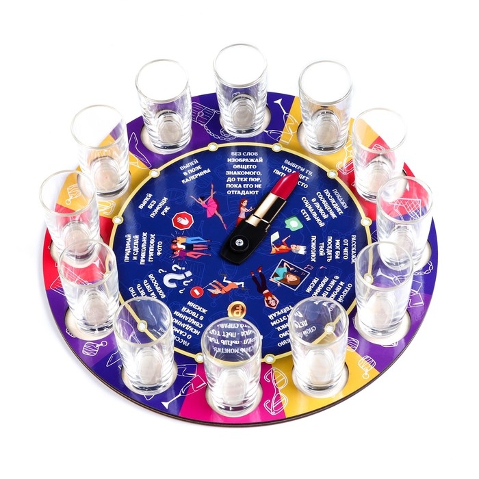 Налейте в стопки алкоголь, раскрутите барабан. После остановки стрелочки в одной из ячеек, человек должен выполнить выпавшее задание. Для разнообразия можно придумывать свои правила игры, например, давайть штрафные задания, если выпавшее задание выполнено недостаточно хорошо, по мнению участников игры.