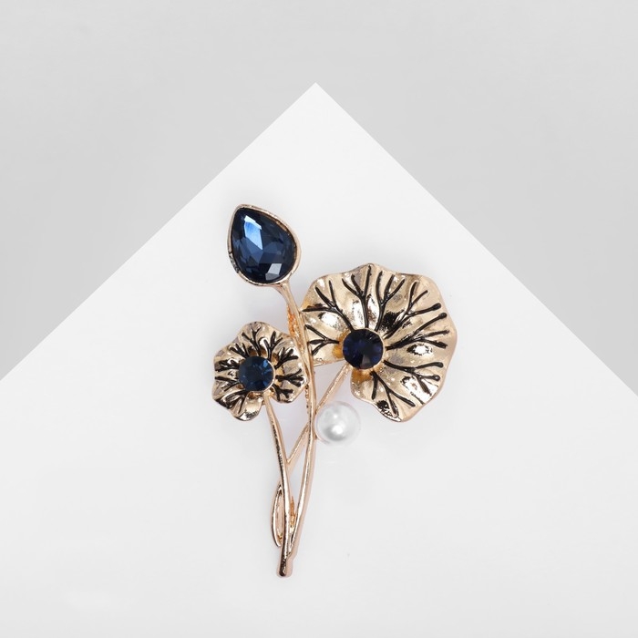 Брошь «Цветы» жемчужная роса, цвет бело-синий в золоте