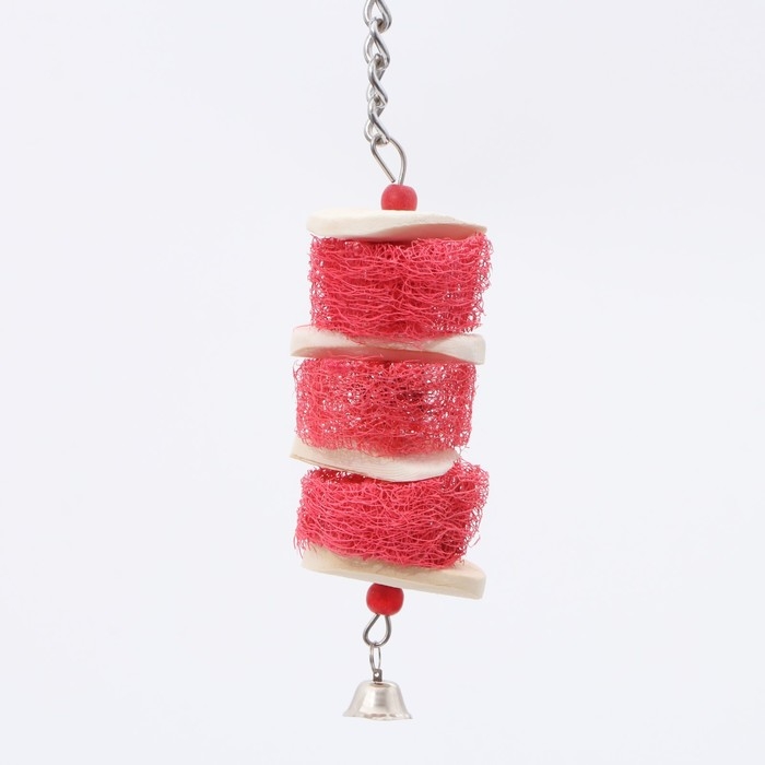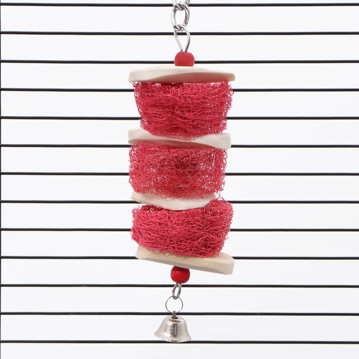 Игрушка с панцирем каракатицы, люфой и колокольчиком имеет размеры 25 х 5 см, что делает ее идеальной для средних и крупных птиц. Понравится питомцам благодаря сочетанию разных текстур: жесткий панцирь каракатицы полезен для стачивания клюва, а люфа стимулирует когти и способствует поддержанию активности.
