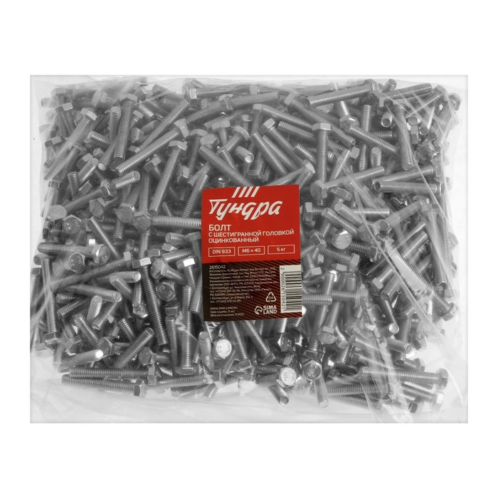 Болт ТУНДРА, оцинкованный, DIN 933, класс прочности 8.8, М6х40 мм, 5 кг