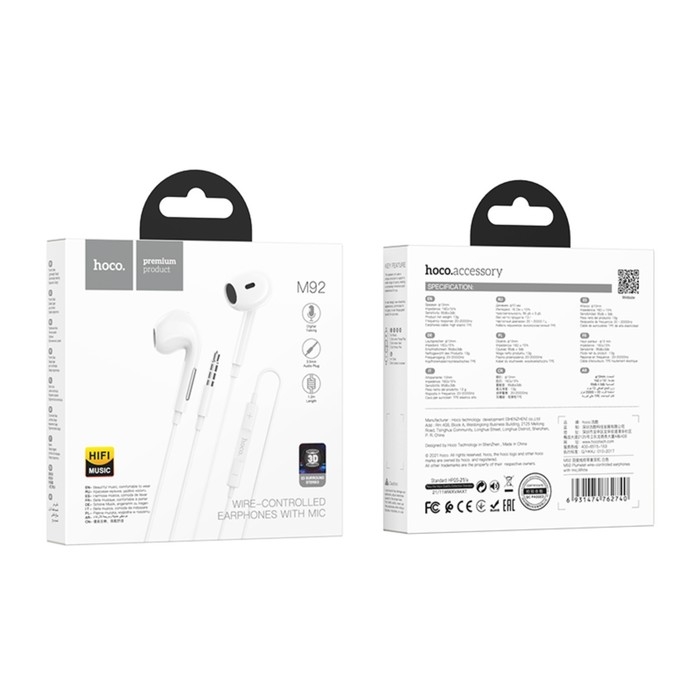 Наушники Hoco M92, проводные, вкладыши, микрофон, 1.2 м, белые