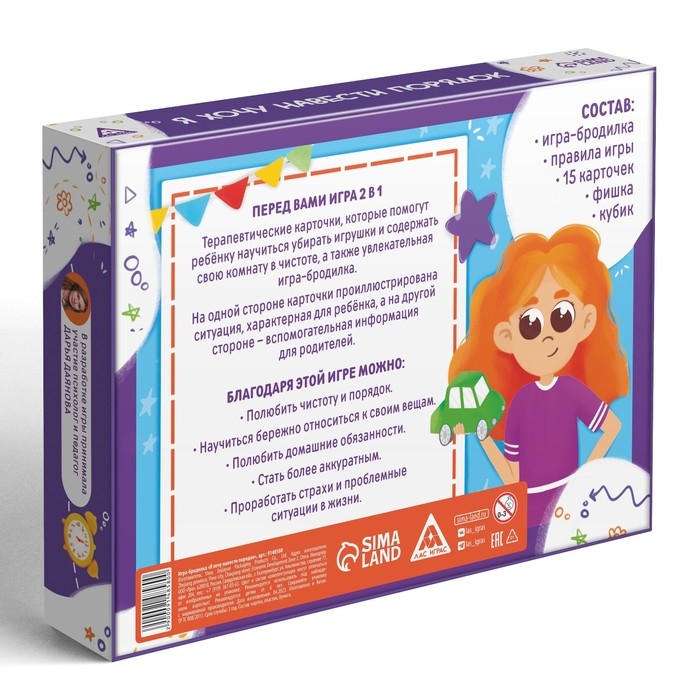 Перед вами игра 2 в 1: терапевтические карточки, которые помогут ребёнку научиться убирать игрушки и содержать свою комнату в чистоте, а также увлекательная игра-бродилка. На одной стороне карточки проиллюстрирована ситуация, характерная для ребёнка, а на другой стороне – вспомогательная информация для родителей.