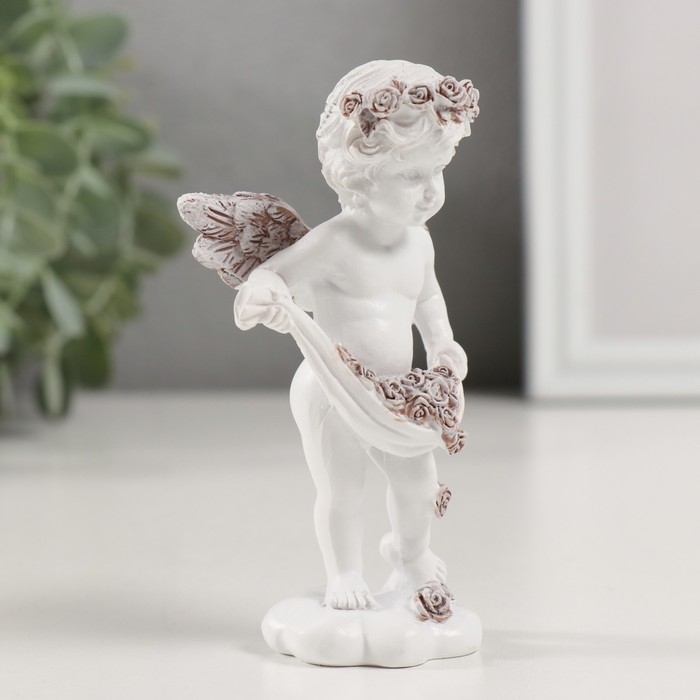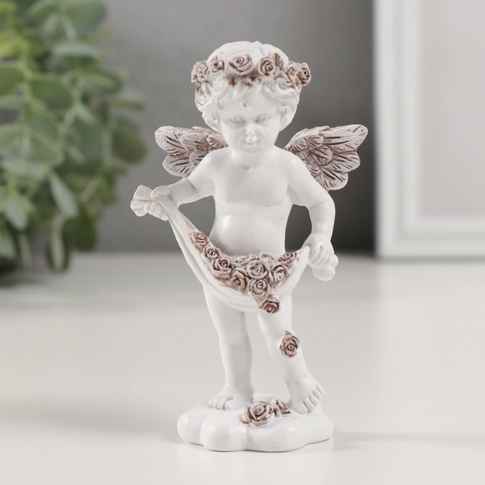 Сувенир полистоун "Ангелочек с лепестками роз" кофейный венок 6,5х4х10,5 см
