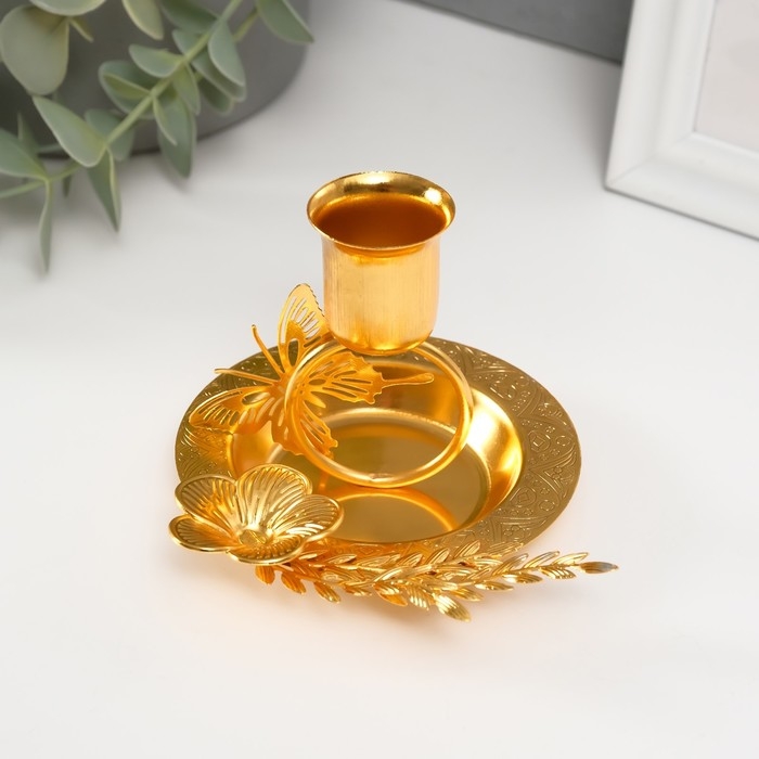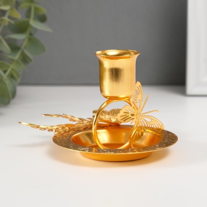 Подсвечник металл на 1 свечу "Бабочка на кольце" золото d=2,5 см 10х11х7 см