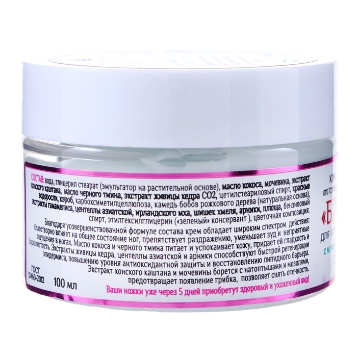 Состав: вода, глицерил стеарат (эмульгатор на растительной основе), масло кокоса, мочевина, экстракт конского каштана, масла черного тмина, хлорофилл-каротиновая паста, ментол, камфора натуральная, экстракт живицы кедра, цетилстеариловый спирт, красные водоросли, кэроб, карбоксиметилллюлоза (безвредный статилизатор), камедь бобов рожкового дерева (натуральная основа), экстракты арники, гамамелиса, центеллы азиатской, ирландского мха, шишек хмеля, плюща, этилгексилглицерин (зеленый консервант), отдушка цветочная.
