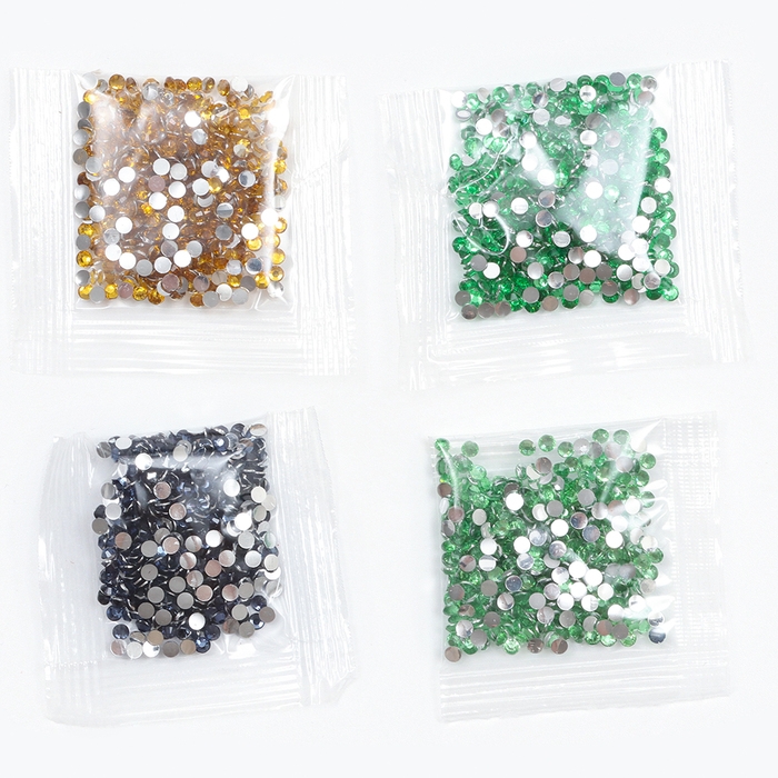 - Из пакетика с номером, который соответствует схеме, отсыпьте в ёмкость немного страз.