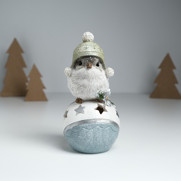 Сувенир полистоун свет "Воробышек в шапке сидит на новогоднем шарике" серый 7,6х9,5х15 см