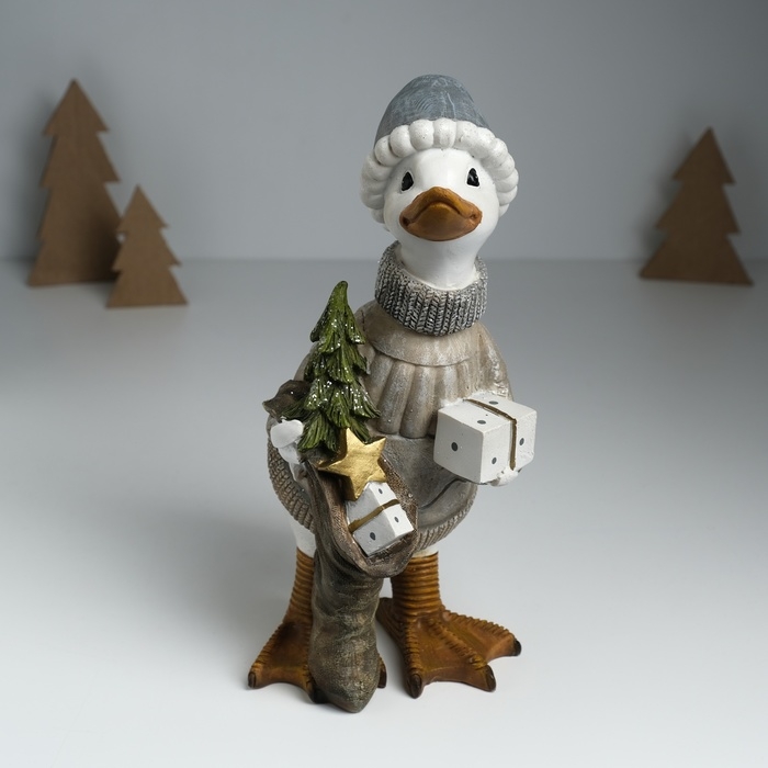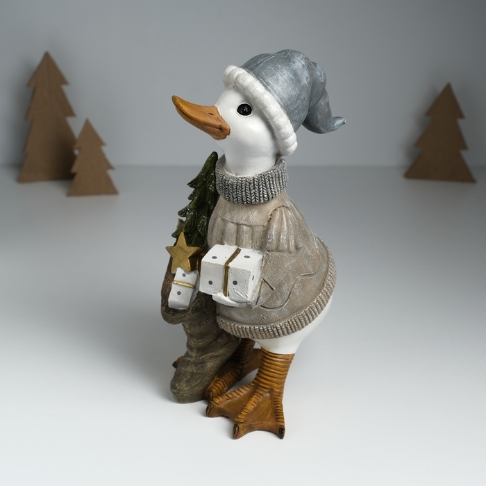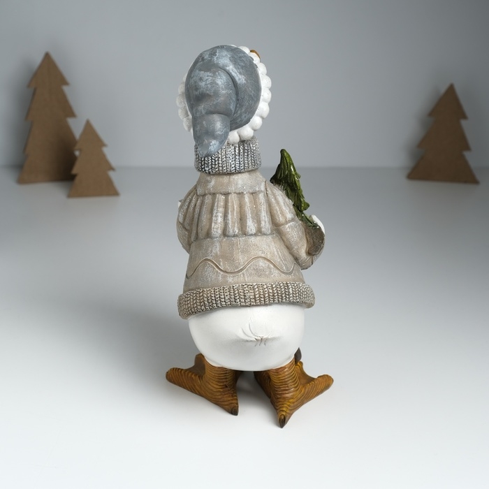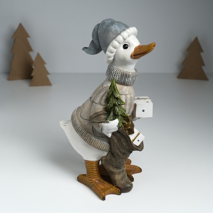 Сувенир полистоун "Гусь в бежевом свитере, с носком с подарками и ёлкой" 12х14х25,5 см