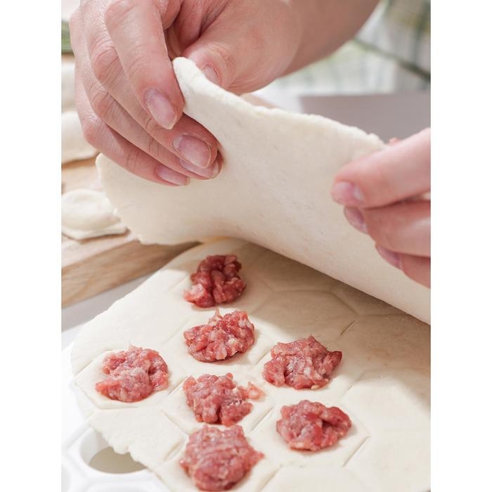 - Раскатываем два одинаковых пласта теста, чуть больше самой пельменницы. Внимательно следите, чтобы тесто было одинаковой толщины по всей площади.
